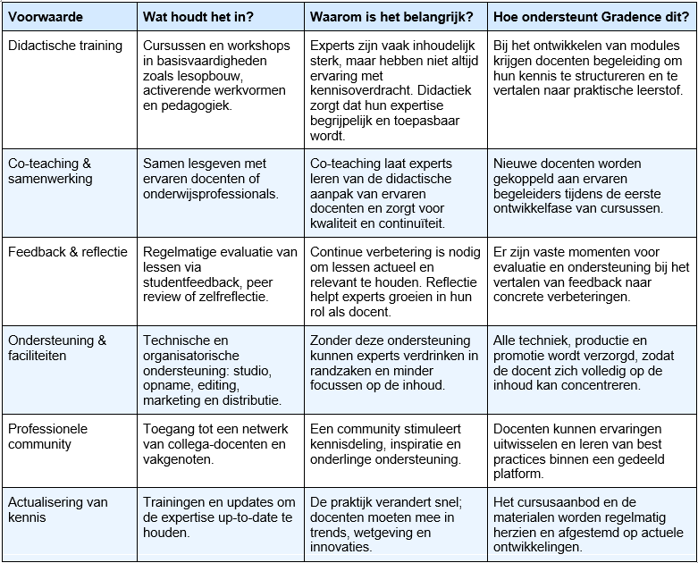 Om experts succesvol in te zetten als docenten, zijn er verschillende voorwaarden die zorgen voor kwaliteit, continuïteit en impact.